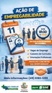 Além da atividade principal, também será efetuado o cadastramento no Sistema Nacional de Emprego (Sine) e repassadas orientações sobre a emissão da Carteira de Trabalho Digital e cadastramento do Número de Identificação do Trabalhador (Nit).