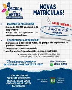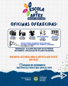 A prefeitura de Marechal Cândido Rondon, por meio da Secretaria Municipal de Cultura, informa que continuam abertas as matrículas para a Escola de Artes do município. As aulas têm início previsto para o dia 9 de fevereiro, com vagas gratuitas e limitadas.